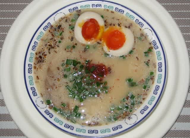 棒ラーメン(熊本)のとんこつ味なのだけど、先日作った時に汁が濃すぎたので今回は袋に書いてあるとおりに作ろうと思った。水480ml使用と書いてあったのでその通りにしたのだけど、間違いなく多すぎ。これじゃ味が薄い(と言うより味がない)。400ml弱ぐらいがよいかなと思う。