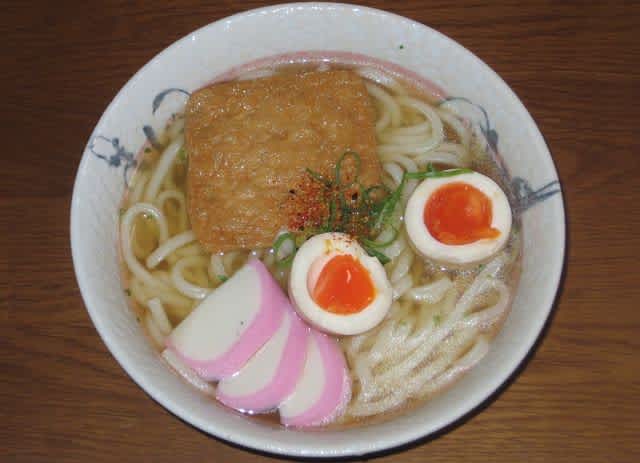 夕食:うどん、昼に揚げた茄子、イカのフライ