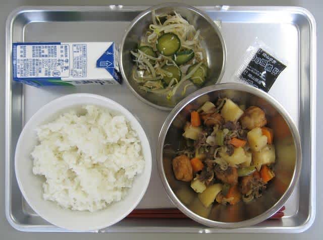 昼食:海苔の佃煮、キュウリの酢の物、肉じゃが