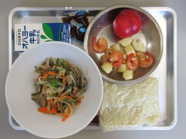昼食:あっさり中華麺、エビとジャガイモの唐揚げ、すもも