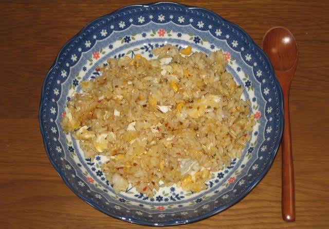 今日の昼食はパンで、苦手なメニューなので朝多めに食べた。永谷園の卵炒飯。