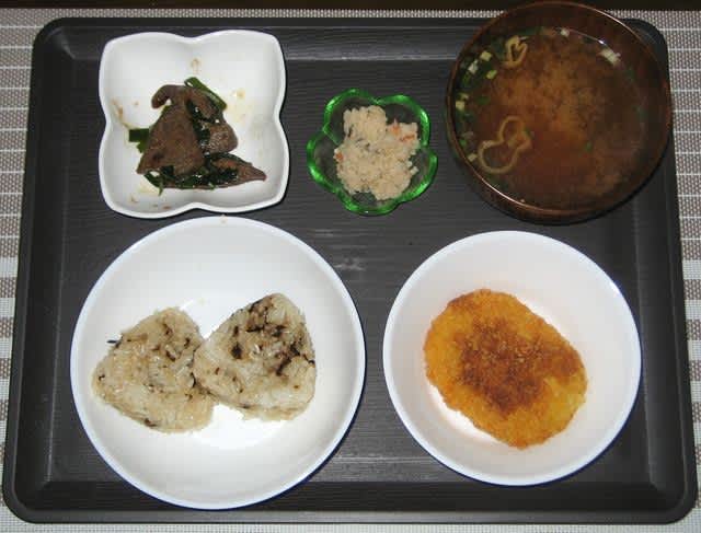 朝食:塩ッペおにぎり、コロッケ、あさげ、レバニラ、おから