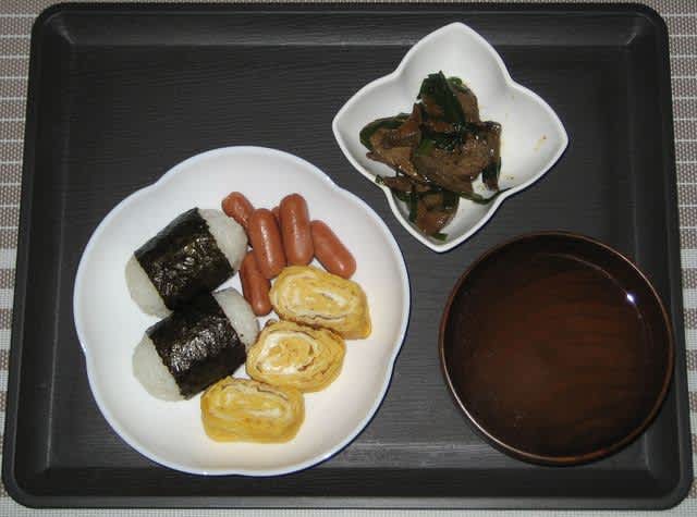 昼食:おにぎり、卵焼き、ウインナー、レバニラ、タマネギコンソメ