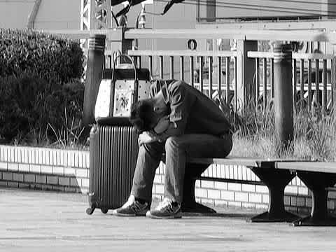 最初は「苦悩する人」と思って撮った。遠くの人物を100mm程度のレンズで撮ったので確認できなかった。よく見るとスーツケースや荷物が写っている。駅のそばだし、この人は旅行者か? でも楽しそうじゃない。困った事態になったのか、単純に疲れ切っているのか。普通ならホテルをチェックアウトする時間じゃない。もっとゆっくり出来るはず。