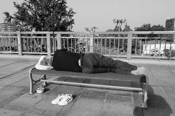 駅前の通路のベンチ。朝早いからさほど暑くはないだろう。しかし、この日は日中は猛暑になった。眠りこけて脱水になってなければ良いが。