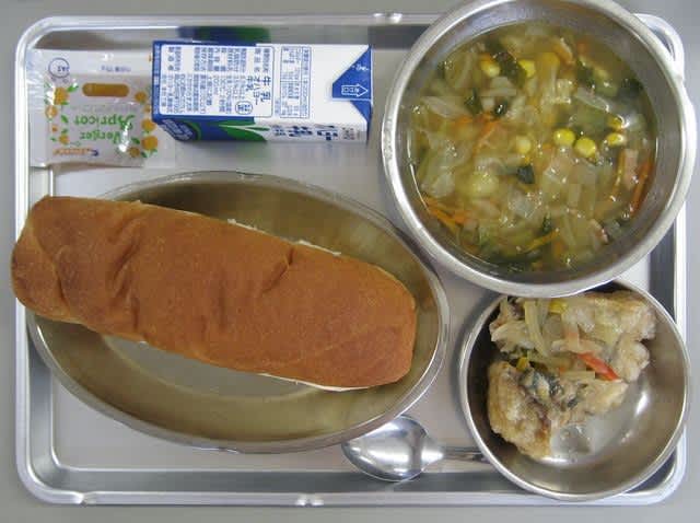 昼食:アジのマリネ、ベーコンスープ、アプリコットジャム、米粉パン