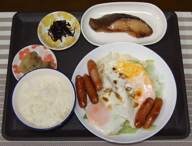 夕食:銀ダラの西京焼き、ソーセージエッグ、搾菜、ごま昆布