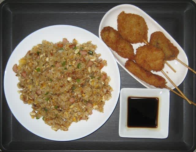 炒飯は自作で、鉄のフライパン製。味が濃すぎてお店みたいになってしまった。私はもっと薄味が好き。串カツは買い物で買ったものの半分。
