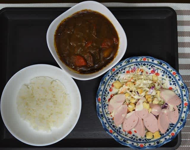 夕食:カレー、サラダ、KFC、新しい搾菜、魚肉ソーセージ