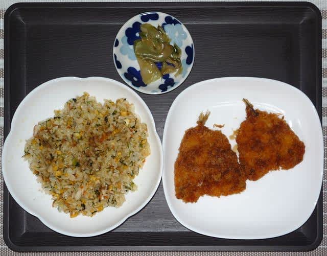 夕食:作り置きの菜飯、以前に買った小さいアジフライ、搾菜