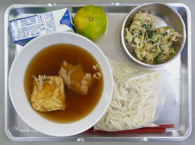 あげに味があまりなかった。うどんは食べられた。アーモンド和えはとても美味しく完食したかったが、固そうな部分は食べるのを止めた。みかんは食べなかった。