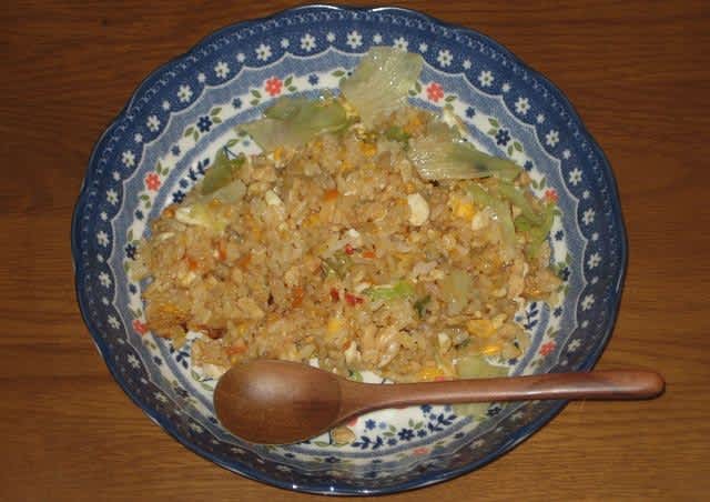 永谷園のたまごチャーハンにこの前チキンライスを作る時に少し余分に作っていた種を使ってアレンジを加えてみた。もともと種に味がついていたから、少し味の濃いチャーハンになった。野菜が食べられてないので、レタスを少し入れてレタスチャーハンもどきにしてみた。