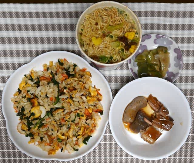 夕食:大根の葉の炒飯、搾菜、コープのカップ麺、煮豚(?)