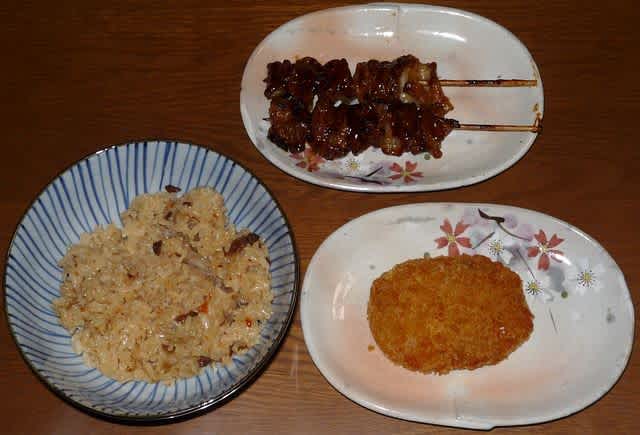 朝食:鶏めし、コロッケ、鶏皮串(タレ)
