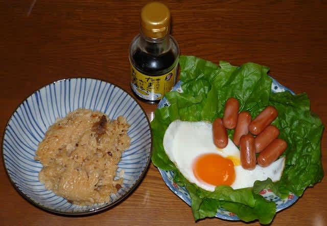 朝食:鶏めし、もらった葉っぱ、ソーセージと目玉焼き