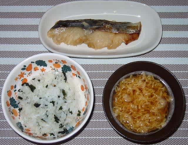 昼食:わかめご飯、ダイソーのチキンラーメン、セブンのサワラの西京焼き