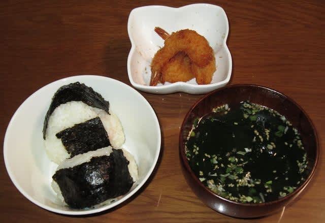 朝食:おにぎり(中に鮭)、エビフライとわかめスープ