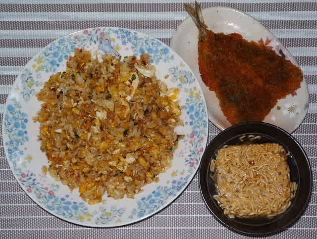 昼食:五目炒飯、アジフライ、百均ラーメン