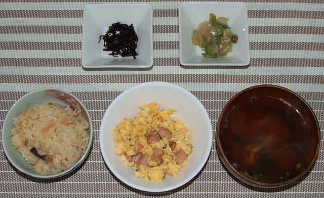 朝昼食:鳥釜飯、ソーセージと卵の炒め物、あさげ、ザーサイ、昆布