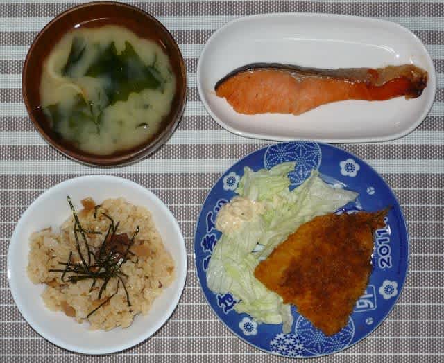 朝食:鶏釜飯、自作味噌汁、搾菜、アジフライ、コロッケ