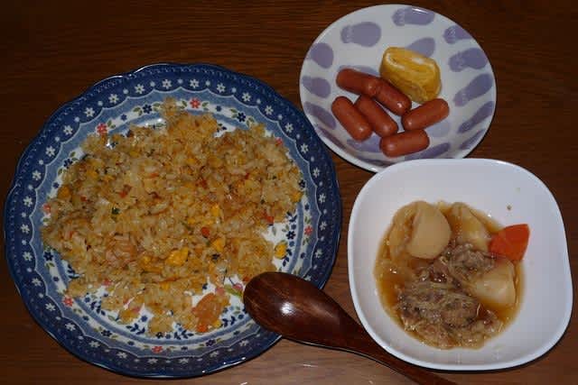 昨日作った冷凍チャーハンが半分残っていたのでそれを作って食べることにした。弁当のおかずもいくらか残るのでそれも食べた。
