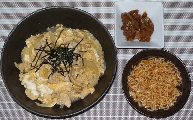 夕食:親子丼もどき、肝の甘露煮、百均のラーメン