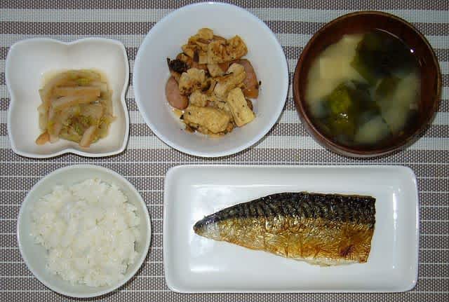 夕食:炊きたてご飯、白菜と練り物の合わせ煮、卵とソーセージの炒め物、セブンの塩サバ、白味噌の味噌汁
