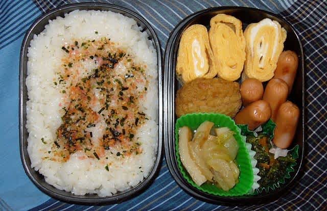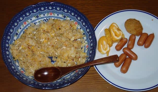 朝食:永谷園の卵チャーハン、お弁当のおかずの残り