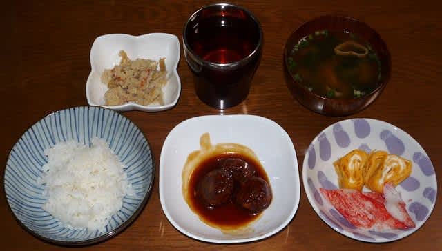 朝食:ご飯、お弁当のおかずの残り、あさげ