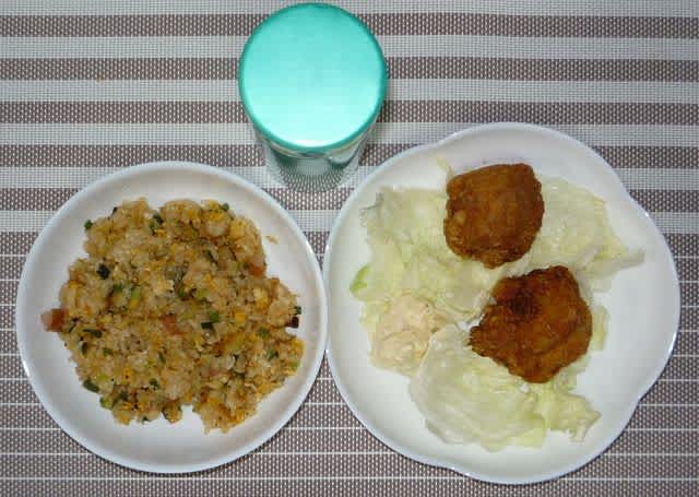 夕食:自作半炒飯、ゆかりの唐揚げ2個