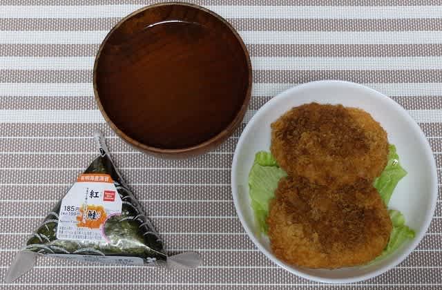 朝食:おにぎり、コロッケ、タマネギコンソメ