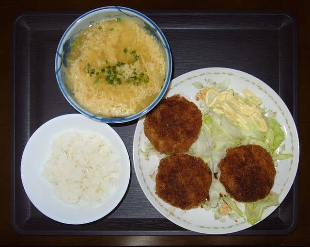 朝食:マルナカの小さいミンチカツ3つ、バチ入り味噌汁