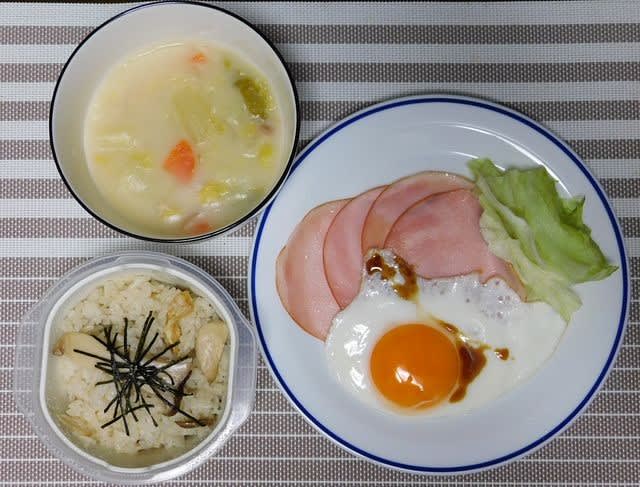 夕食:ハムエッグ、シチュー、エリンギの炊き込みご飯