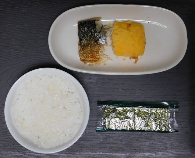 朝食:白ご飯、残っていた魚、卵焼き、海苔