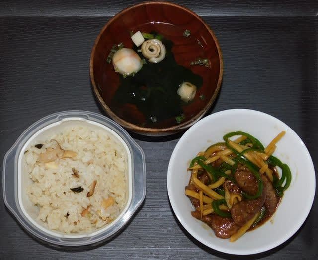 夕食:青椒肉絲、手鞠麩を入れたお吸い物、エリンギ炊き込みご飯