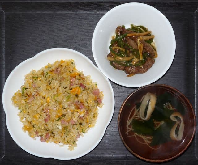 朝食:作り置きチャーハン、バチ入りお吸い物、青椒肉絲