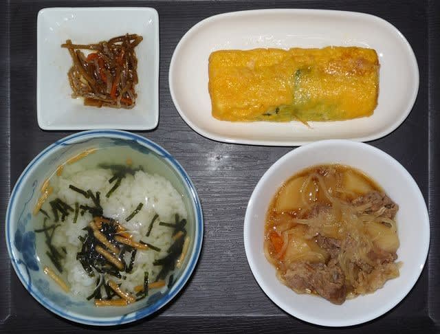 夕食:お茶漬け。セブンの肉じゃが、余っていたきんぴら、大葉チーズだし巻き