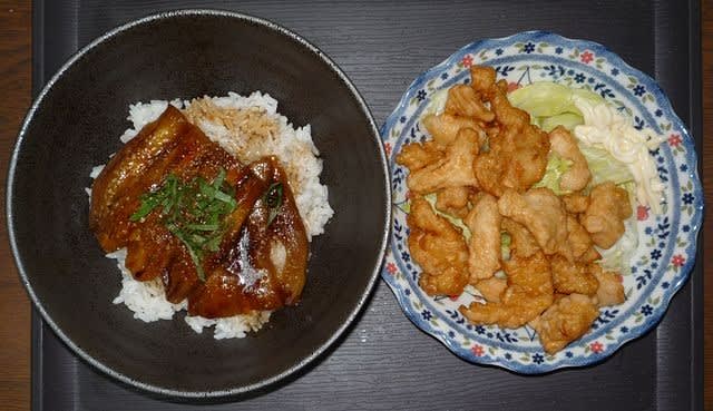 昼食:茄子の蒲焼丼、安い店の唐揚げ