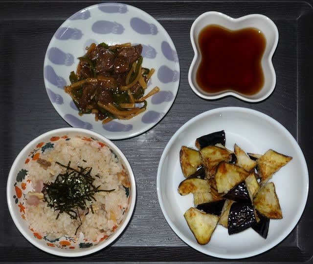 夕食:ひらたけの炊き込みご飯、茄子の素揚げ、青椒肉絲