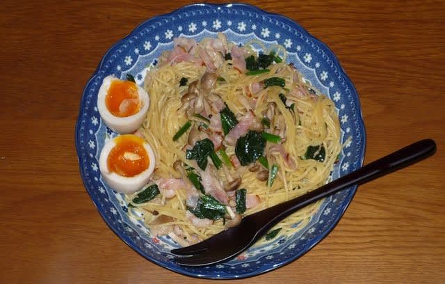 ぶなしめじが半分弱残っていたので使ってしまいたかった。そこで昨日、持って降りるからベーコンとほうれん草でパスタを作ってほしい旨伝え、さらにこういう形で作ってほしいというリクエストもしておいた。