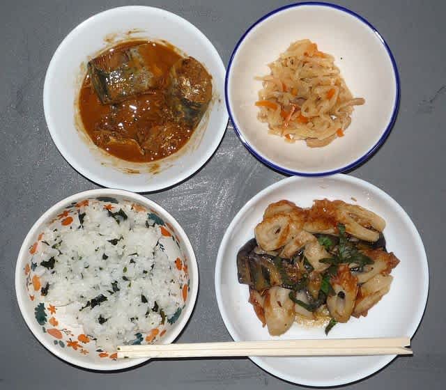 夕食:わかめご飯、茄子とちくわのごま油炒め、鯖缶、切り干し大根