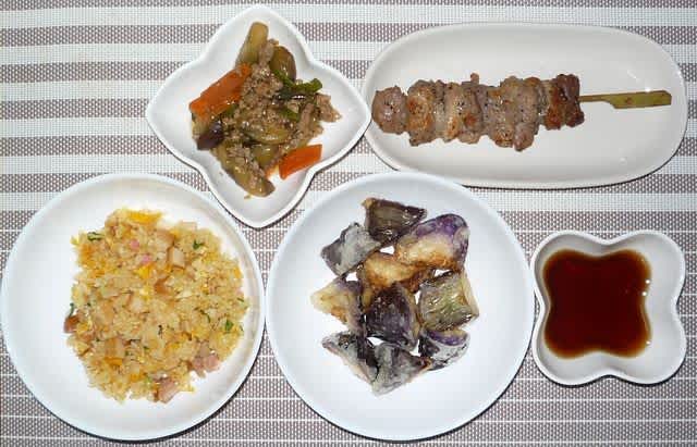 夕食:半炒飯、茄子の素揚げ、麻婆茄子、デイリーの豚タンルート串