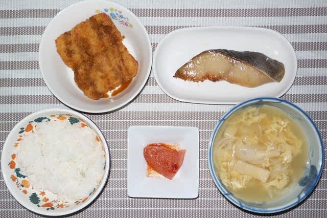 朝食:エビカツ、銀だら、玉ねぎと揚げの味噌汁、辛子明太子