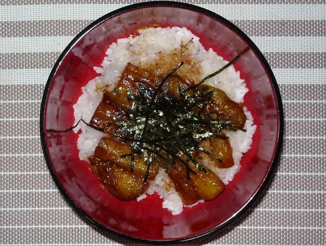 ご飯を3合炊いてその中の少しだけをダイソーのお椀に入れ、蒲焼のタレをご飯にかけタレでグツグツした茄子を上に置き山椒をふりかけた。お腹はそれなりに良かったんだけど、今までと全然違う作り方をしたのでどんな味なのかと試食してみた。まあこの作り方で良いのではないかと思う。