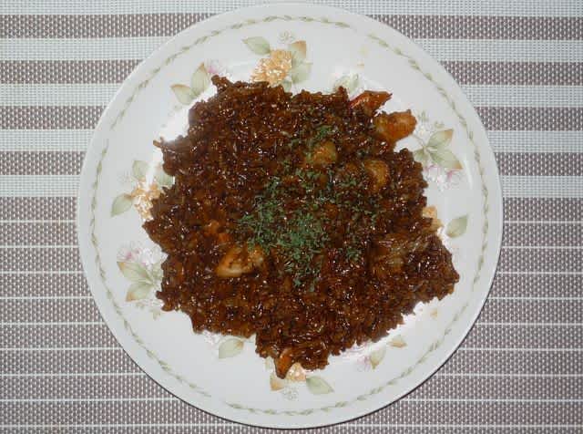 前も書いたけど、このエビ飯の素はご飯1合で作ることになっている。いくらなんでもそれでは味が薄くなりすぎるんではないかと思いながらも書いてある通りに作ってみた。エビ飯を食べたことがない人はこの色の濃さで随分味が濃いのだろうと感じるだろうけど、見た目だけで味はそんなに濃くも辛くもない。今回は大きめのエビを4匹ほど切って入れてみたのだが、半分(つまり0.5合)でこれぐらい。