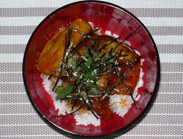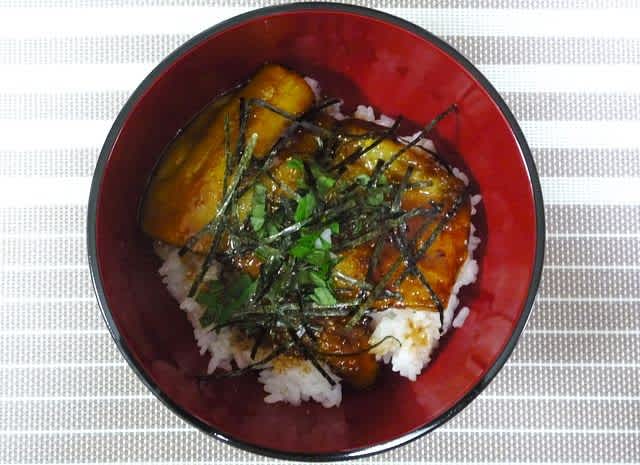 茄子がもう1本残っていて、もう萎びてダメかと思っていたらそうでもなく、いくらか種はできていたけど大したことなかったので1本丸々使って蒲焼丼にしてみた。うまい具合に大葉があったので大葉も海苔も山椒もかけてみた。今回は市販の蒲焼ソースは使わなかったが私には結構フィットしていた。甘すぎるのが好きではないのでレシピよりも砂糖を減らしてみた。これぐらいが私にはいい。