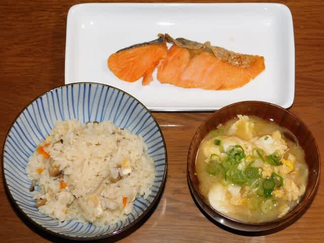 夕食:きのこご飯、セブンの鮭、玉ねぎと卵の味噌汁