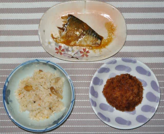 朝食:きのこご飯、ミンチカツ、残っていた鯖の味噌煮