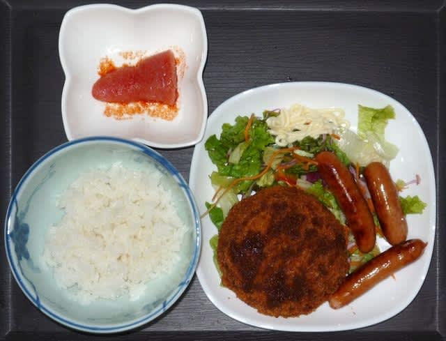 朝食:辛子明太子、デイリーヤマザキのミンチカツ、シャウエッセン、レタスの野菜パック