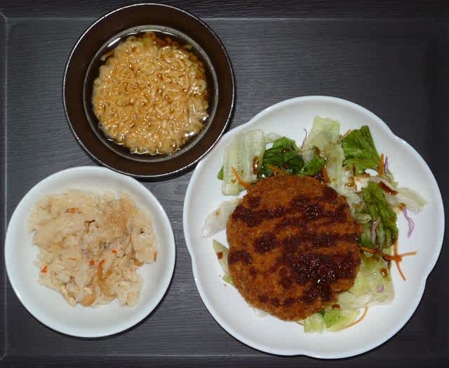 味噌汁を作ろうかとも思ったけど、そこまで必要はなかったので余っていたミニチキンラーメンをお汁代わりにした。例によって生野菜は嫌だったけど我慢した。